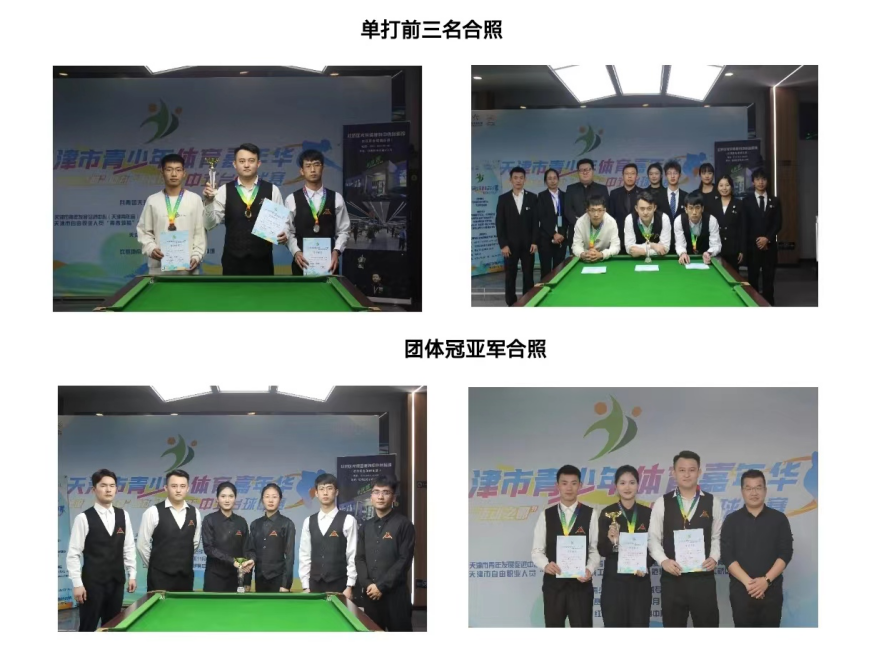 2023年11月25-26日,由天津市青年宫,天津市青少年体育协会承办,共青团天津市委员会,天津市体育局主办,天津市青少年体育协会台球专委会协办的天津市青少年体育嘉年华中式台球比赛,在红桥体育中心台球馆隆重开幕。刘保华院长作为领队,宋鑫老师担任教练带领校台球代表队17名队员参加个人组和团体组的比赛。经过两天的顽强拼搏,最终beat365台球队队员包揽个人组冠亚军,团体组前四名,展示beat365台球队整体的实力。比赛过程中展现的精神风貌获得了主办方领导和宣传媒体的高度评价。在此次比赛中获得了成绩和精神文明的双丰收,充分体现了思政元素融入台球课程和训练后产生的积极效果。